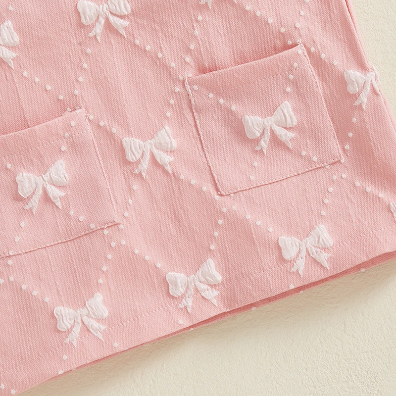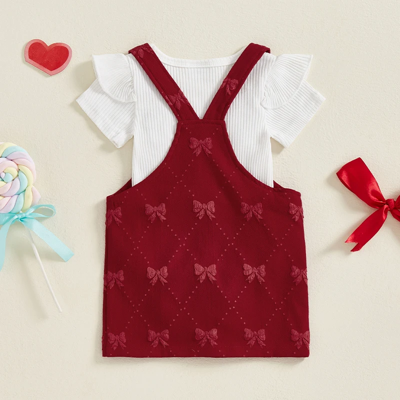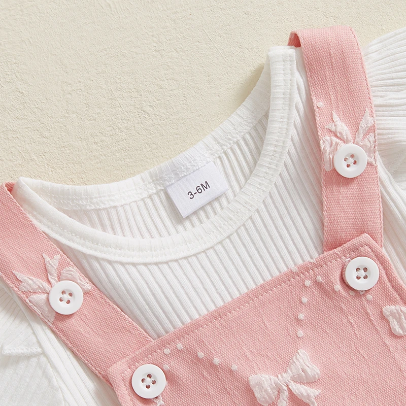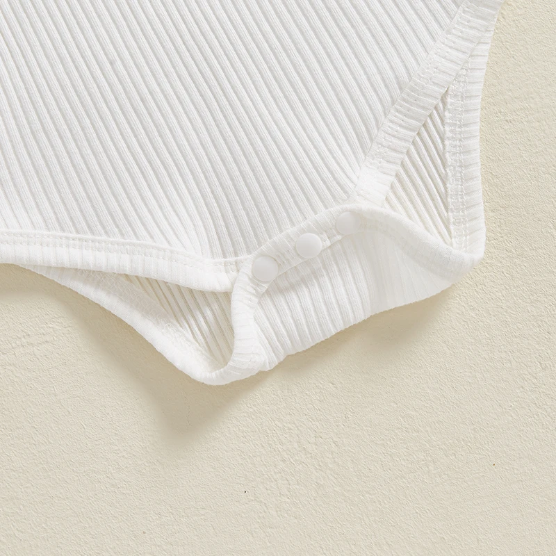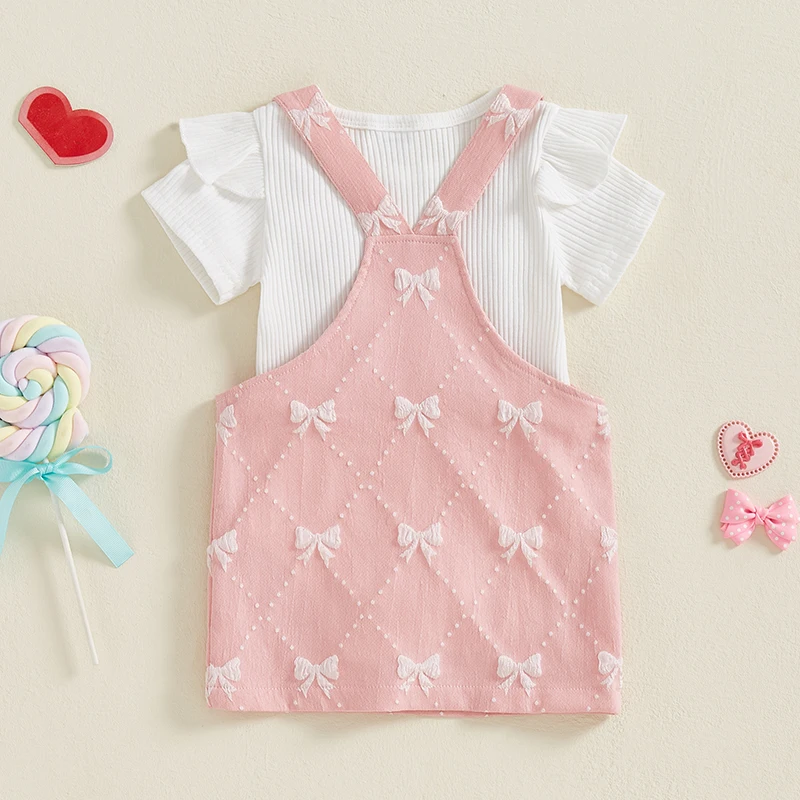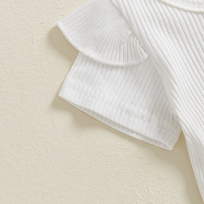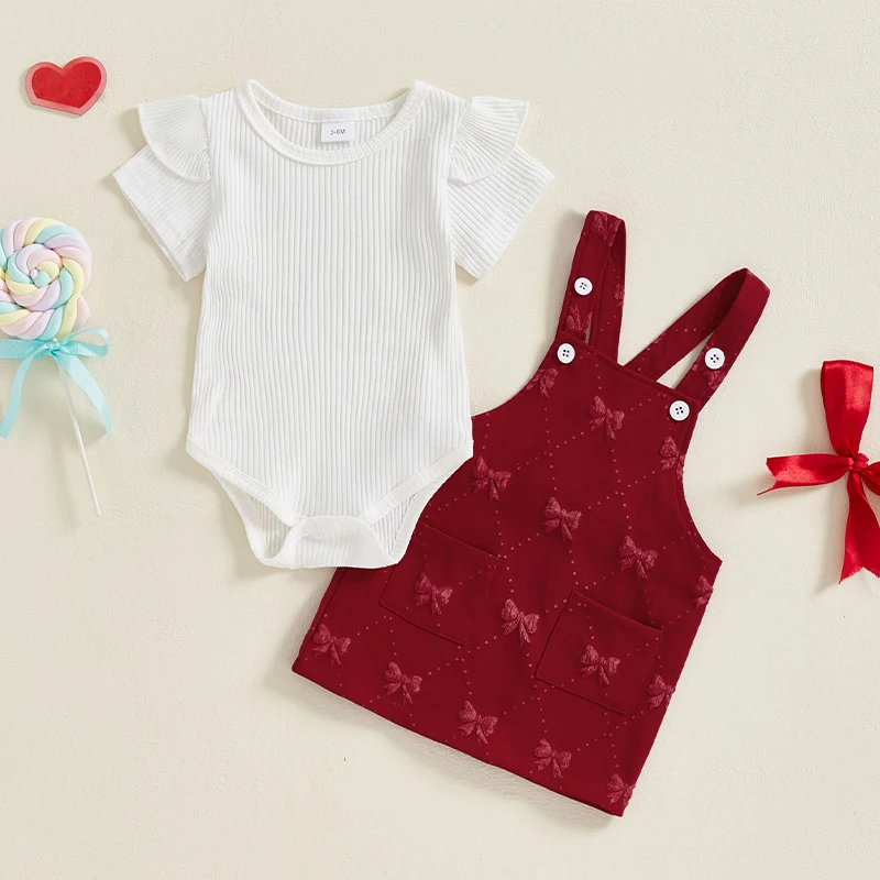 Baby Girls Summer Clothes Solid Ribbed Short Sleeve Romper with Bow Pattern Overall Dress 2 Pcs Set