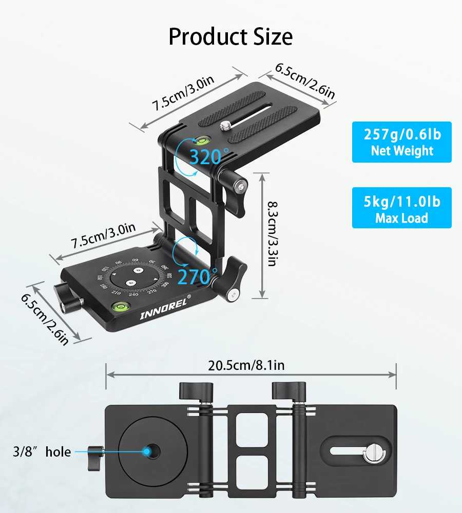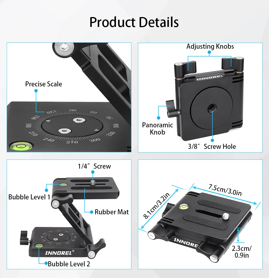 【Bubble Level & Panoramic Pan】 The 360° rotational base allows for panoramic shots and two built-in bubble levels can help to keep your camera level in any situation.