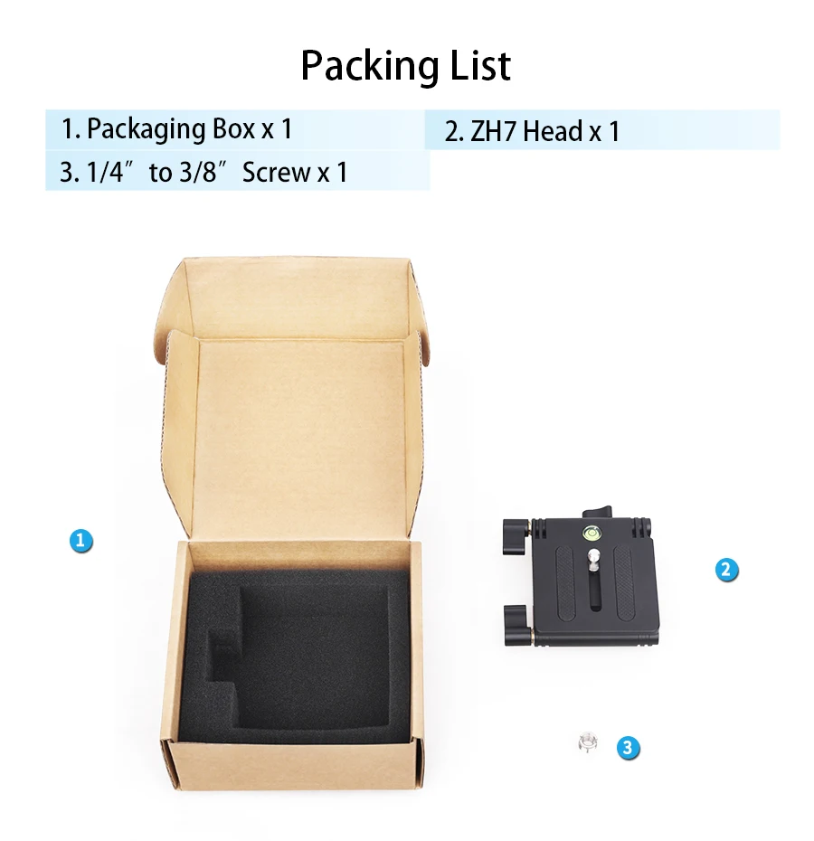 【Package】 There is a packaging box, a ZH7 Z flex tilt head and a 1/4" to 3/8"screw in the package.